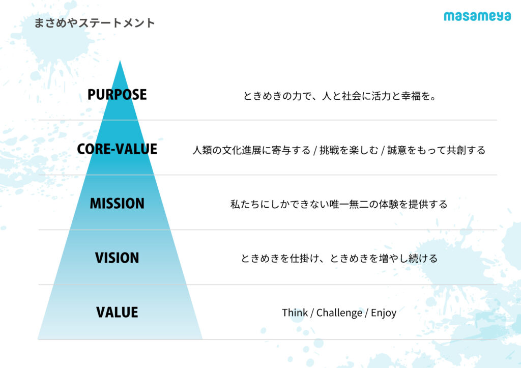 株式会社まさめやは、パーパス、コアバリュー、ミッション、ビジョン、バリューを定めています。